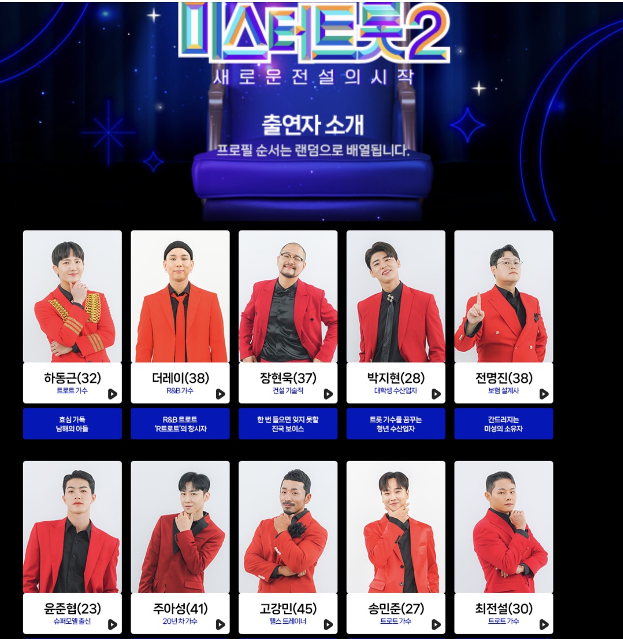 미스터 트롯 2는 매주 목요일 오후 10:00에 tv조선에서 방송이 됩니다. 지금 공식 홈페이지에 들어가면 단독으로 선공개된 영상이 있습니다. 2022.12.22일부터 2023.3.16 일까지 총 13부작으로 방송될 예정이고, 오디션이 끝나도 특별 편성으로 새로운 예능들이 방영되지 않을까? 생각됩니다.