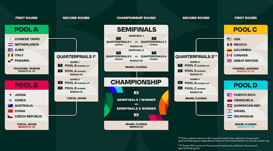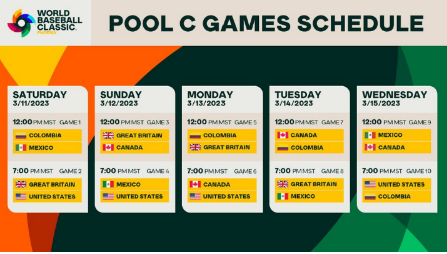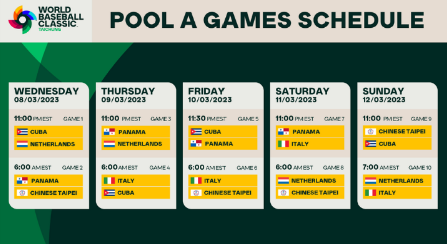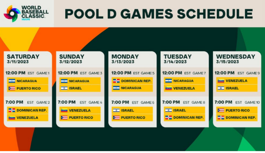 이번 WBC 경기에는 총 a조에는 쿠바, 이탈리아, 네덜란드, 파나마, 대만이 속해 있습니다. 그리고 c조에는 미국, 멕시코, 콜롬비아, 캐나다, 영국이 포진되어 있습니다. 마지막으로 D조에는 푸에트토리코, 베네수엘라, 도미니카공화국, 이스라엘, 니카라과가 포함되어 있습니다.