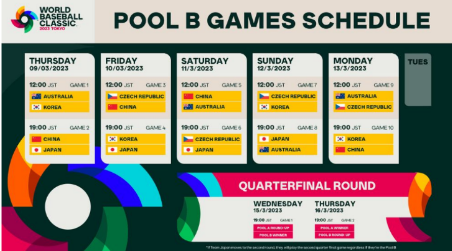우리나라는 일본, 호주, 중국 체코와 함께 b조에 속해 있습니다. 이 중 1,2위만 다음 라운드에 진출할 수 있는데요. 우리의 지난 전적으로 봐서는 무난히 다음 라운드에 진출 가능할 것으로 보입니다. 그러나 방심은 금물이겠지요? 지난 2013, 2017년의 뼈아픈 과거를 다시 한번 상기시키고 신중한 경기를 해야 할 것 같습니다.